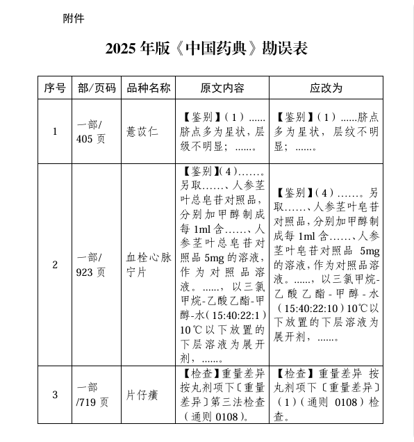 具体勘误细节见《2025 年版〈中国药典〉勘误表》,确保各项操作符合药典要求。